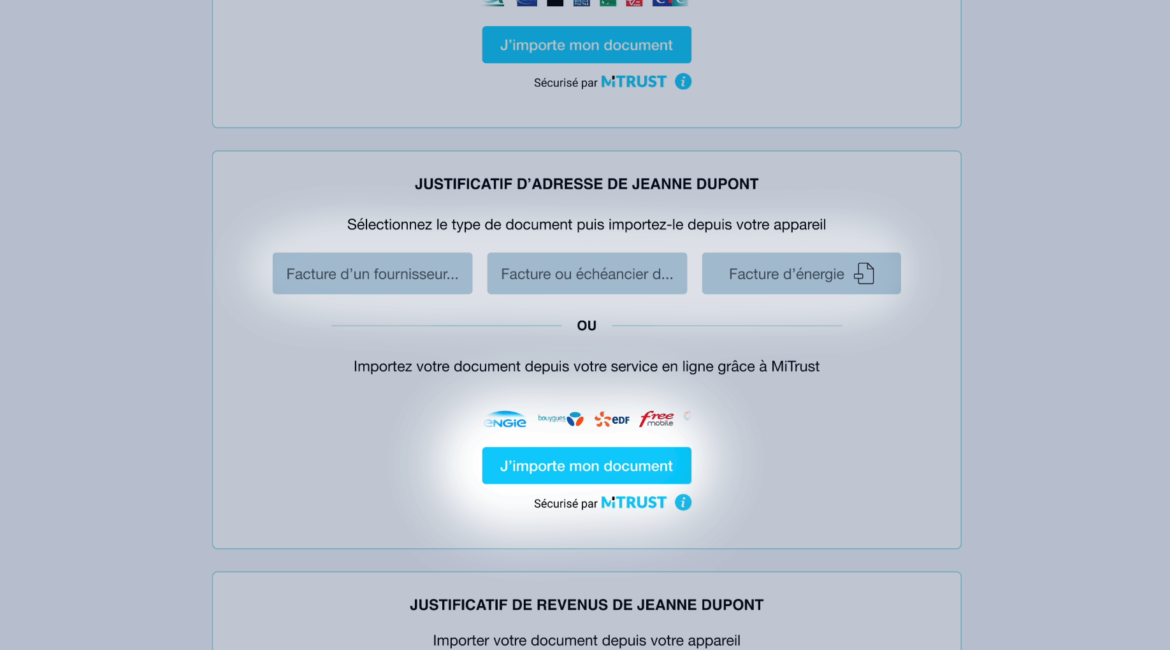 For the user, document retrieval time is drastically reduced: no need to scan, photograph, transfer or download the document. The user connects via MiTrust to one of his MiTrust-connected service providers, selects and validates the sharing of his data and documents instantly. Subscription is simplified and the abandonment rate reduced: just as it is anachronistic today to pay for an online purchase with cash or cheque, it will soon be so to use a document download to transfer qualified data.